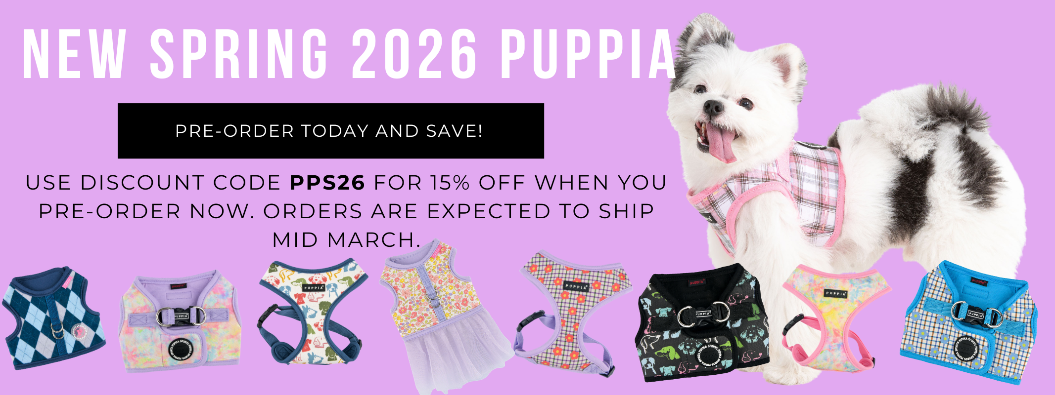 New items are added every week! We carry a great selection of dog harnesses, coats, sweaters, dresses, collars, accessories, dog travel bags and carriers, beds, shoes, clothing and much more!